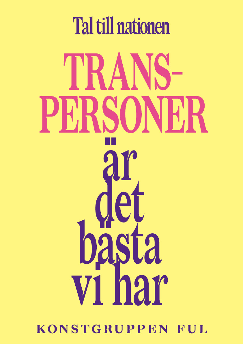 As part of the art project Tal till nationen*, the art group Ful has invited people of all ages interested in art to take part in open poster workshops on the theme of freedom of expression. All posters created have since been draped in the graphic design of Tal till nationen.